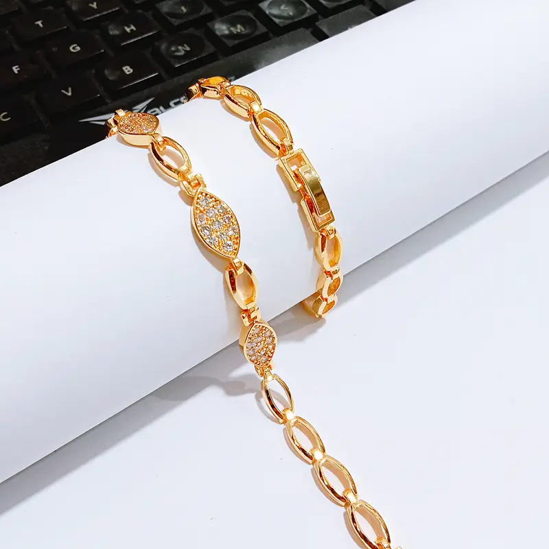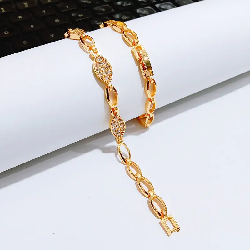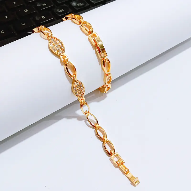Harga grosir untuk 1 pcs gelang. Panjang 18 cm dengan desain elegan. Gelang rantai dengan permata zircon yang berkilau. Terbuat dari cooper alloy lapis emas dengan kualitas premium. Material anti karat dan non alergi, aman untuk kulit sensitif.