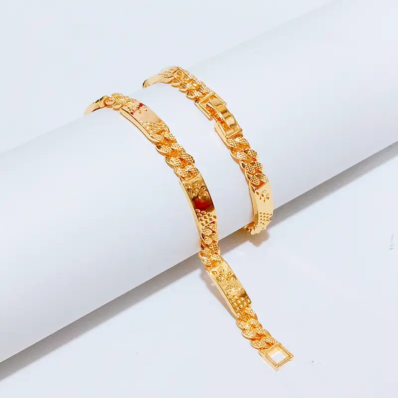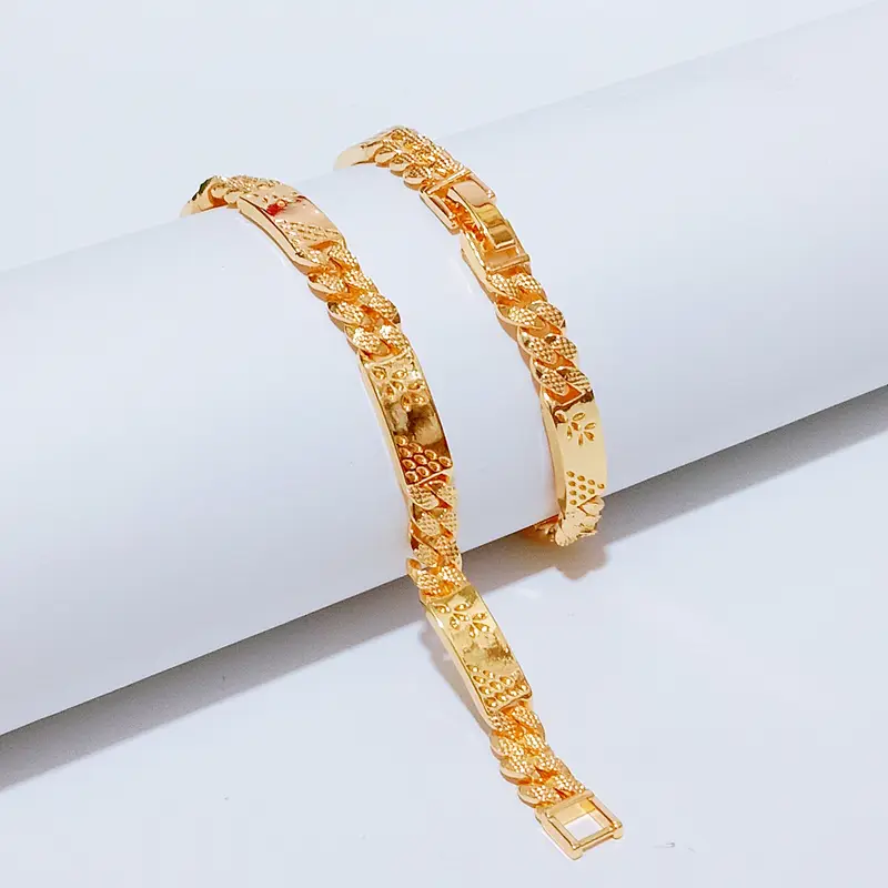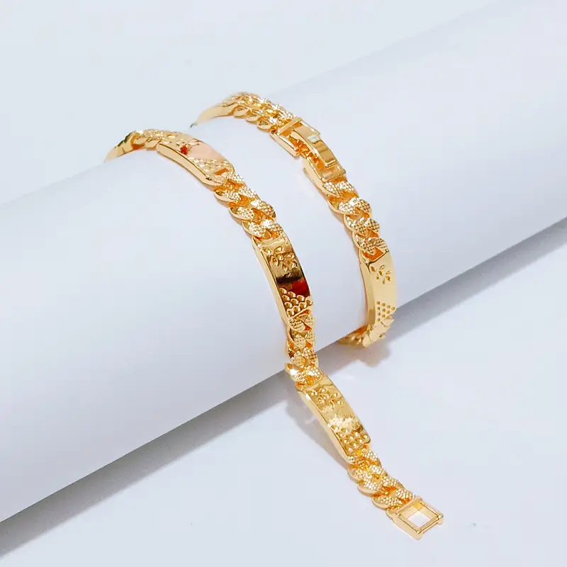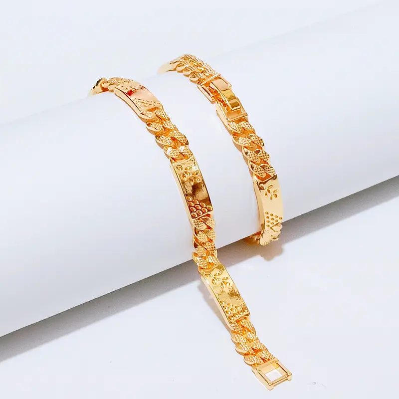 Harga grosir untuk 1 pcs gelang. Panjang 18 cm dengan lebar 7 mm. Gelang rantai plat dengan lapisan emas gold yang elegan. Terbuat dari cooper alloy lapis emas dengan kualitas premium. Material anti karat dan non alergi, aman untuk kulit sensitif.